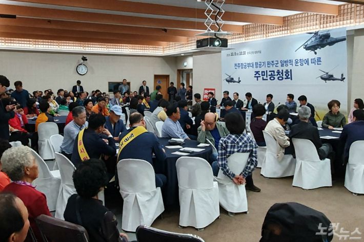 전북 완주군이 전주 항공대대 소음 문제를 해결하기 위해 주민공청회를 열었다. 박성일 완주군수 등 군청 관계자와 지역 정치인은 물론 전주시와 항공대대 측도 참석해 지역 여론을 수렴했다. 비행장주 변경·활주로 신설 등 이날 제시된 대안을 두고 군민들은 '인간의 존엄성을 지켜달라'며 조속한 대책 마련을 촉구했다.