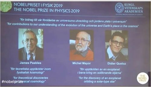 올해 노벨 물리학상은 우주 진화의 역사와 구조에 대한 이론적 해명과 최초의 외계행성을 발견한 미국과 스위스 천체물리학자 3명에게 돌아갔다.