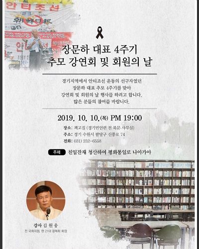 그러면서 "4주기를 맞아 장 대표가 꿈꿔 왔던 친일적폐 청산과 평화의 시대로 나아가야 한다는 의미를 공유하고자 한다. 많은 분들이 함께 해주길 바란다"고 강조했다.