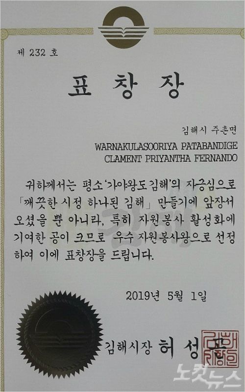 ◇김효영> 경남 김해시가 선정하는 자원봉사왕에 스리랑카에서 온 이주노동자가 선정됐다고 합니다. 이주노동자가 이 상을 받은건 아주 특별한 케이스인데요.