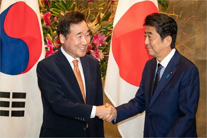 이낙연 국무총리가 24일 오전 일본 도쿄(東京) 총리관저에서 아베 신조(安倍晋三) 총리와 악수하고 있다. (사진제공=연합뉴스)