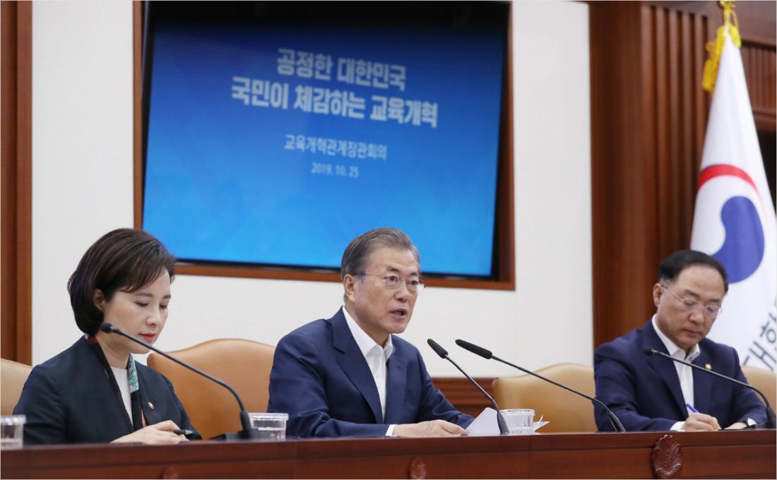 문재인 대통령은 25일 "정시가 능사는 아닌 줄은 알지만, 그래도 지금으로서는 차라리 정시가 수시보다 공정하다는 입시당사자들과 학부모들 목소리에 귀를 기울여야 한다"고 말했다.