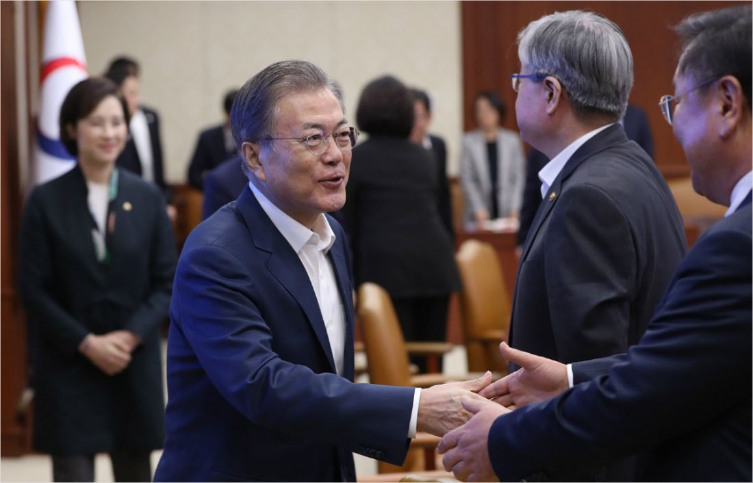 문재인 대통령이 25일 오전 정부서울청사에서 열린 교육관계 장관회의에서 김태년 민주당 교육공정성강화특별위원장과 악수하고 있다.(사진=연합뉴스)