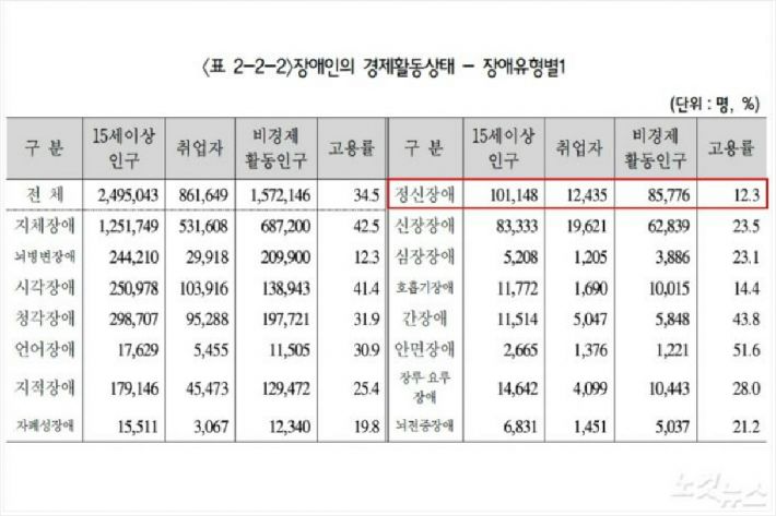 ◆ 유선희> 네, 한국장애인공단 고용개발원에서 발표한 자료에 따르면 지난해 5월 기준 정신장애 고용률은 12.3%에 불과했습니다. 이는 다른 15대 장애 중 가장 낮은 수준으로 분석됐습니다.