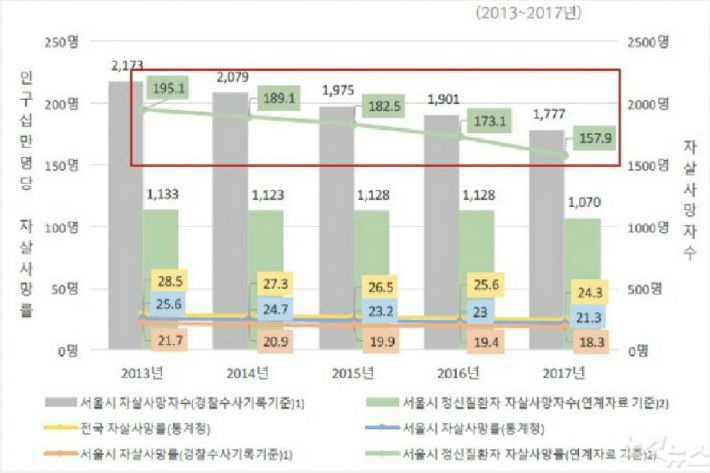 이는 인구 10만 명당 전국 자살사망률인 2013년 28.5명, 2014년 27.3명, 2017년 24.3명과 비교해 볼 때 비교해 볼 때 7배 정도 높은 수치입니다. 이어 서울시 자살사망률과 살펴보면 8배 정도 높은 것으로 파악됩니다.
