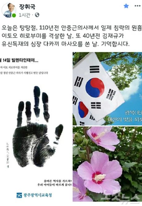28일 광주광역시교육청에 따르면 장 교육감은 지난 26일 자신의 SNS에 "오늘은 탕탕절. 110년 전 안중근 의사께서 일제 침략의 원흉 이토 히로부미를 격살한 날. 또 40년 전 김재규가 유신독재 심장 다카키 마사오를 쏜 날. 기억합시다."라는 글을 게재했다.