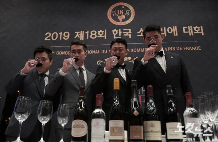 28일 오전 서울 중구 밀레니엄 서울 힐튼에서 프랑스 농식품부 주최, 소펙사 코리아 주관으로 열린 '2019 제18회 한국 소믈리에 대회'에서 참가자들이 블라인드 테이스팅을 하고 있다.