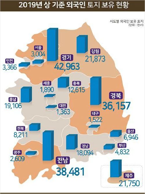 이들 외국인 소유의 땅이 가장 많은 곳은 경기 지역으로 나타났다. 경기 지역에는 지난해 말보다 2.7% 늘어난 4296만㎡가 외국인의 땅이었고, 전남은 3848만㎡, 경북은 3616만㎡, 강원은 2187만㎡, 제주는 2175만㎡에 달했다.