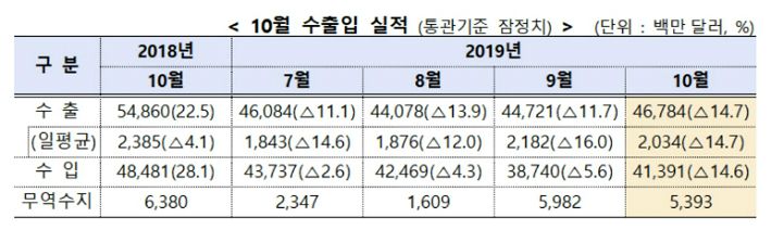 수출은 지난해 12월부터 줄곧 감소세를 보였고, 특히 지난 6월 이후 5개월째 두자릿수 감소율이 계속됐다. 전년 동월 대비 감소율은 지난 2016년 1월(-19.6%) 이후 3년 9개월만에 가장 컸다.