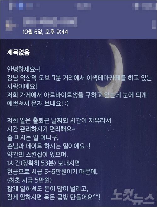 문자메시지에는 "술 마시는 일 아니구, 손님과 데이트 하는 일"이라며 "약간의 스킨십이 있으며, 1시간(정확히 53분) 보내면 현금으로 시급 5~6만원이기 때문에, (최초 시급 5만원) 짧게 일해도 돈이 많이 벌리고 길게 일하면 목돈 금방 만들어"라고 돼 있다.