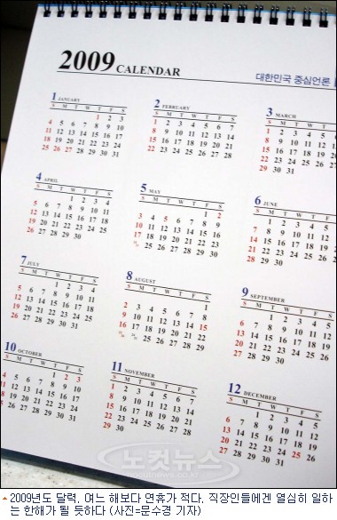 2008년을 한 달여 정도 남겨둔 지금, 직장인들은 벌써부터 내년도 달력을 살펴보느라 바쁘다. 연휴 및 공휴일의 분포도를 사전 체크하기 위한 것. 하지만 황금연휴가 줄을 이은 올해와 달리 2009년 달력을 보면 한숨부터 새나온다.