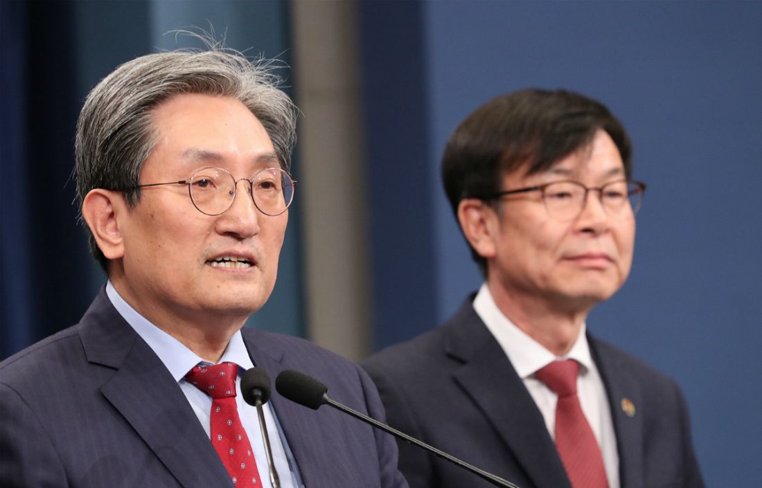 청와대 노영민 대통령 비서실장(왼쪽)이 10일 오후 춘추관 대브리핑룸에서 열린 기자간담회에 앞서 모두발언하고 있다. 오른쪽은 김상조 정책실장. (사진=연합뉴스)
