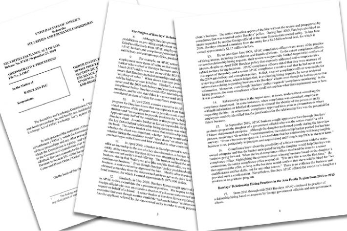 11일 미국 증권거래위원회에 따르면 영국계 글로벌 투자은행인 바클레이즈의 아시아·태평양 본부는 2009년 4월부터 2013년 8월까지 이같은 수법으로 117명을 부정 채용했다. 이에 따라 630만달러의 과징금을 부과당했다.