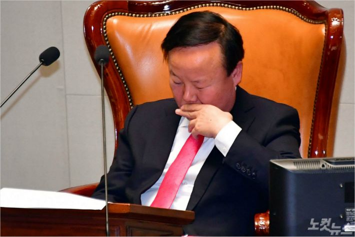 8일 국회에서 열린 예산결산특별위원회 전체회의에서 김재원 위원장이 생각에 잠겨있다. (사진=윤창원 기자)