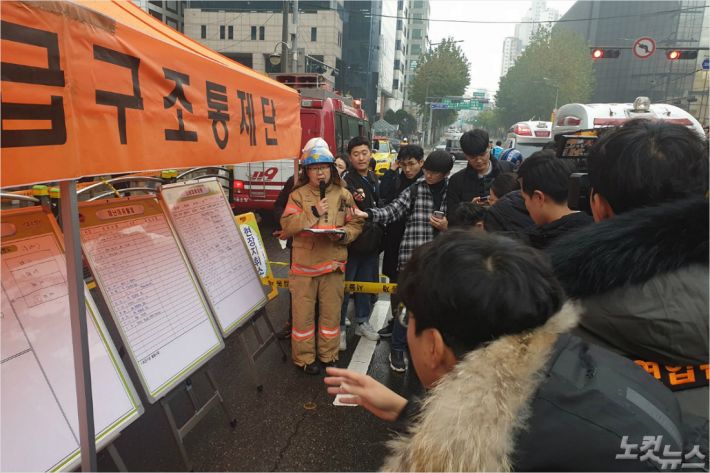 서울 서초구 서초동 진흥상가 화재 현장에서 소방관계자가 브리핑을 하고 있다.(사진=서민선 기자)