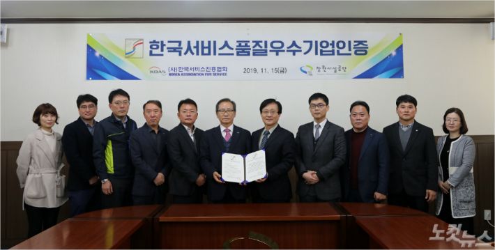 지난 15일 허환구 이사장(왼쪽 6번째)이 유상현 한국서비스진흥협회 부회장(오른쪽)으로부터 인증서를 받은 뒤 관계자들과 기념촬영을 하고 있다. (사진=창원시설공단 제공)