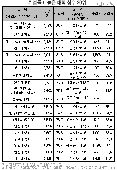 졸업생 2천명 이상인 대학의 경우 중대 안성 캠퍼스가 올 4월1일 기준으로 취업률 86.4%를 나타내 최고를 기록했다.