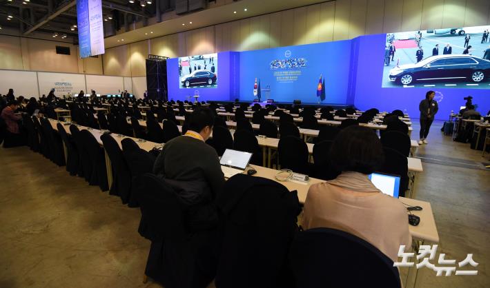 ‘2019 한·아세안 특별정상회의’를 하루 앞둔 24일 오후 부산 해운대구 벡스코 제1전시장에 미디어센터가 마련돼 있다.