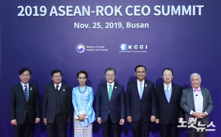 25일 부산 벡스코 2전시장에서 열린 2019 한-아세안 특별 정상회의 ‘CEO 서밋(Summit)’ 행사에서 문재인 대통령 등 참석자들이 기념촬영을 하고 있다. 왼쪽부터 성윤모 산업통상자원부 장관, 통룬 시술릿 라오스 총리, 아웅산 수치 미얀마 국가고문, 문 대통령, 쁘라윳 짠-오차 태국 총리, 박용만 대한상의 회장, 짐 로저스 로저스홀딩스 회장. [2019 한-아세안 특별정상회의 제공]