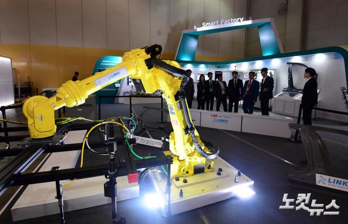 25일 오후 부산 해운대구 벡스코에서 열린 ‘한·아세안 스타트업 엑스포, ComeUp’ 에 참가한 KT 관계자들이 5G 제조 클라우드로 실시간 연결되는 산업용 로봇을 선보이고 있다.