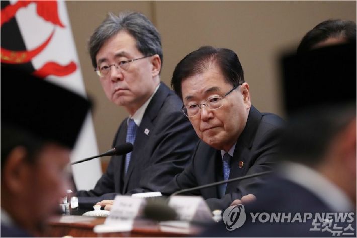 정의용 청와대 국가안보실장(오른쪽)과 김현종 2차장이 24일 오전 청와대에서 열린 하사날 볼키아 브루나이 국왕과의 정상회담에 참석해 있다. (사진제공=연합뉴스)
