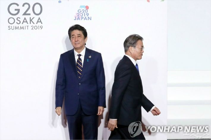 문재인 대통령이 지난 6월 28일 오사카에서 열린 G20 정상회의 공식환영식에서 일본 아베 신조 총리와 악수한 뒤 이동하고 있다. (사진제공=연합뉴스)