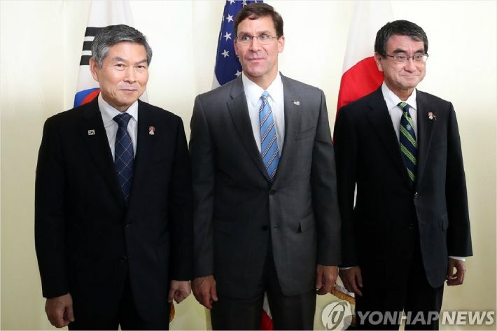 제6차 아세안 확대 국방장관회의(ADMM-Plus) 참석차 태국을 찾은 정경두 국방부 장관이 17일 방콕 아바니 리버사이드 호텔에서 열린 한·미·일 국방장관 회담에서 마크 에스퍼 미국 국방부 장관, 고노 다로 일본 방위상과 포토세션을 하며 포즈를 취하고 있다. (사진제공=연합뉴스)