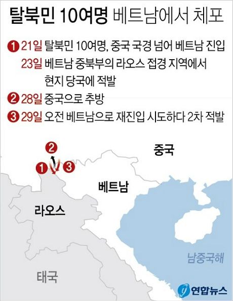 앞서 이들은 브로커의 안내를 받아 베트남으로 진입해 라오스로 향하던 중 베트남 당국에 체포돼 28일 중국으로 추방됐고, 다음 날 오전 또다시 베트남으로 진입하려다 체포된 것으로 알려졌다.