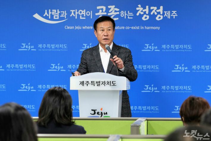 박근수 제주도 환경보전국장이 오리온 제주용암수의 국내 판매가 지속될 경우 염지하수 공급을 끊겠다는 입장을 밝히고 있다. (사진=박정섭 기자)