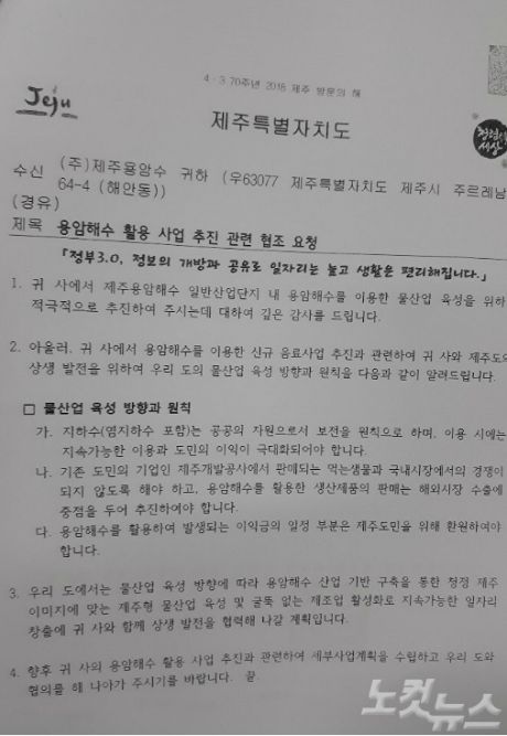 더불어 "도지사나 제주도청 관계자 누구도 국내판매를 용인하고, 염지하수를 공급한다는 언급은 전혀 없었다"며 "오히려 제주도의 공수화 원칙상 국내 판매는 안된다는 방침을 수차례 밝혔다"고 전했다.