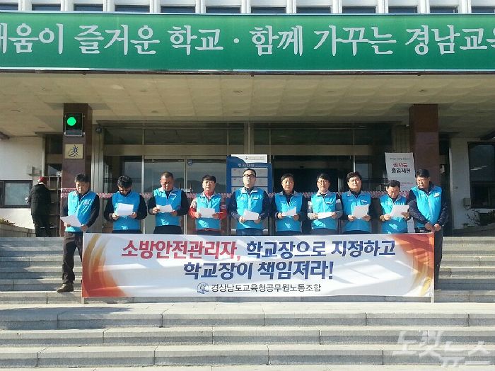 경남교육노조는 "각급 학교장은 마땅히 감독직에 있는 위치에 있고 '공공기관의 소방안전관리에 관한 규정' 제4조에는 학교장이 소방안전관리에 대한 감독 책임을 지도록 하고 있다"며 "그러나 학교장들은 이를 해태하고 행정실장을 지정 선임하고 있다"고 강조했다.