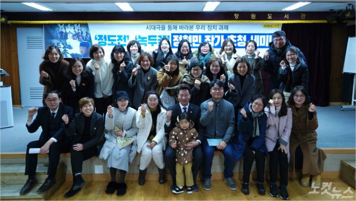 창원 성산 여영국 국회의원이 '공감·경청 민심투어 만인보(萬人步) 민생 프로젝트' 일곱 번 째로 지난 7일 창원도서관 시청각실에서 드라마 <정도전>, <녹두꽃>을 집필한 국회입법보좌관 출신 정현민 작가 초청 특강과 세미나를 개최했다.