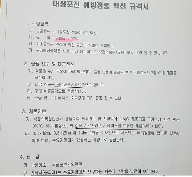 이에 대해 곡성군은 "백신에 대한 불안감 해소와 안전하고 믿을 수 있는 백신 접종을 위해 품목허가를 받은 2개 백신 중 임상연구와 실제 진료환경연구 데이터를 보유한 백신 납품을 명시한 것"이라고 밝혔다.