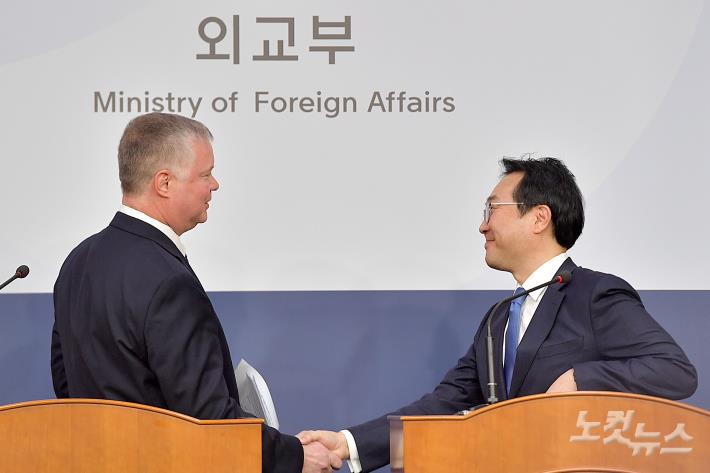이도훈 외교부 한반도평화교섭본부장과 스티븐 비건 미국 국무부 대북정책특별대표가 16일 오전 서울 종로구 도렴동 외교부 청사 브리핑룸에서 기자회견을 마친 뒤 악수하고 있다.