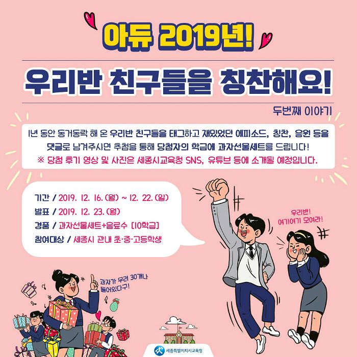 '아듀 2019! 우리반 친구들을 칭친해요!' 댓글 이벤트는 16일부터 오는 22일까지 7일 동안 진행된다. 세종시 초·중·고 학생이라면 누구나 참여할 수 있다.