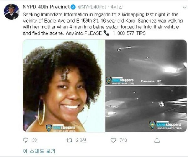 사건 발생 15시간이 지날 무렵인 이날 오후 2시 33분 다행스럽게도 뉴욕 브롱크스 경찰은 캐롤이 무사히 발견됐다고 트위터를 통해 밝혔다.