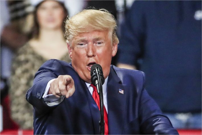 도널드 트럼프 대통령이 18일(현지시간) 미시건 주 배틀크릭의 켈로그 아레나에서 지지자들을 상대로 유세를 하고 있다.(사진=EPA/연합뉴스 제공)