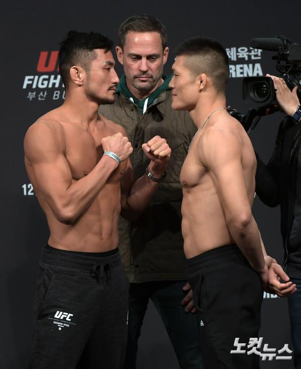 강경호가 20일 부산 사직실내체육관에서 열린 ‘UFC Fight Night 부산( UFC 부산) 공식 계체량에서 핀구얀과 포즈를 취하고 있다.