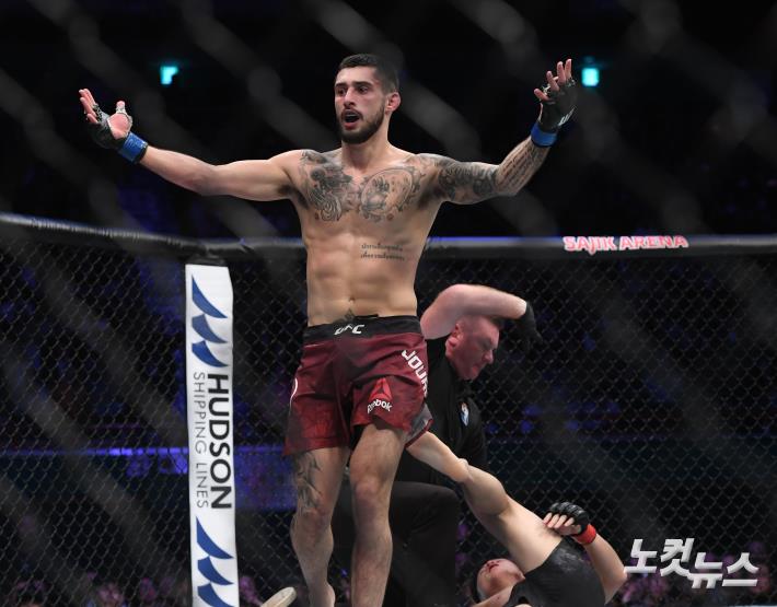 21일 오후 부산 사직실내체육관에서 열린 'UFC 파이트 나이트 부산' 메인카드 페더급 경기. 찰스 쥬르뎅이 최두호에게 TKO 승리를 거두고 있다.