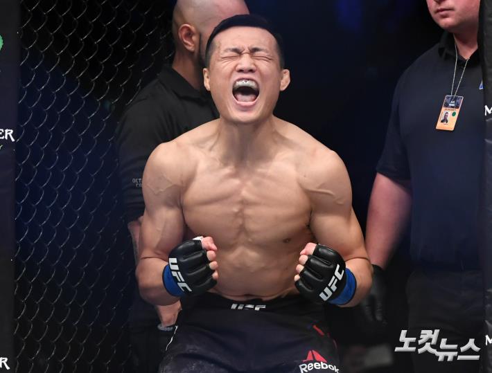 21일 오후 부산 사직실내체육관에서 열린 'UFC 파이트 나이트 부산' 메인카드 페더급 경기. 정찬성이 프랭키 에드가와 경기 전 환호성을 지르고 있다.