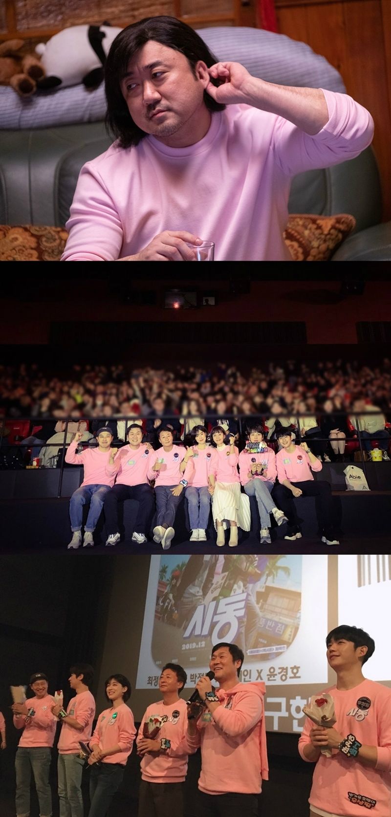 '시동' 팀은 개봉 전주였던 지난 14~15일, 연분홍색 옷을 입고 무대인사를 하러 다녔다. 연분홍색은 극중 거석이 형의 시그니처 컬러다. (사진=NEW 제공)
