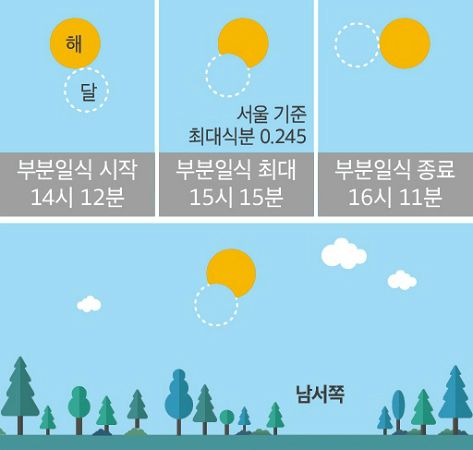 부분일식 현상은 오후 3시 15분 최대, 오후 4시 11분에 끝난다.