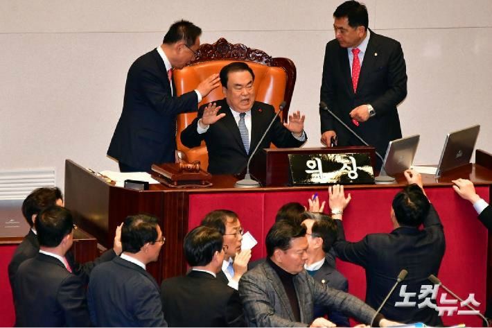 문희상 국회의장이 지난 23일 저녁 국회 본회장에서 자유한국당 심재철 원내대표, 이주영 국회부의장 등 의장석을 둘러싼 한국당 의원들의 항의를 받고 있다. (사진=윤창원 기자/자료사진)