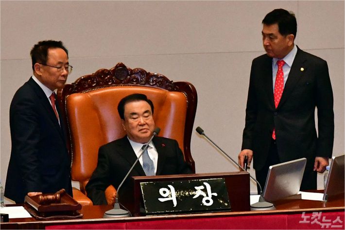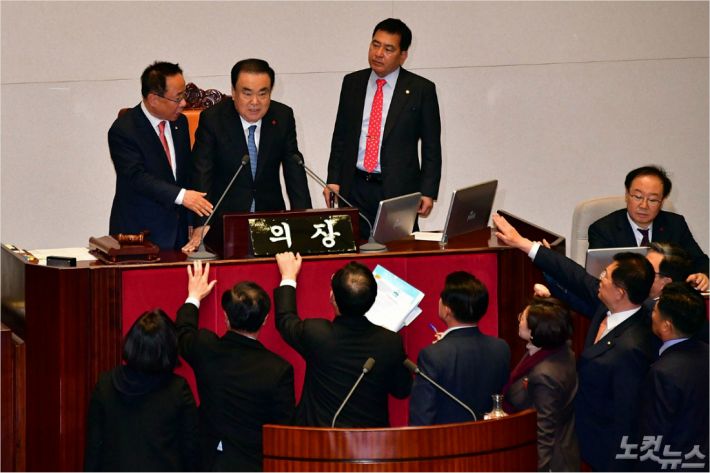 문희상 국회의장이 23일 저녁 국회 본회장에서 자유한국당 심재철 원내대표, 이주영 국회부의장 등 의장석을 둘러싼 한국당 의원들의 항의를 받고 있다.(사진=윤창원 기자)