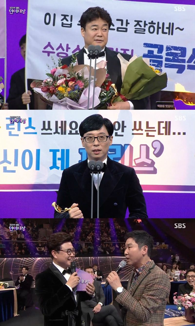 2019 SBS '연예대상'에서 각각 공로상과 대상을 받은 방송인 백종원과 유재석. 신동엽은 대상을 받게 된다면 트로피를 바닥에 던지겠다는 강력한 거부 선언으로 웃음을 자아냈다. (사진=SBS '연예대상' 캡처)