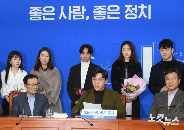 더불어민주당 '영입인재 2호'인 원종건 씨가 29일 서울 여의도 국회에서 열린 더불어민주당 인재영입 발표회에서 소감을 말하고 있다.
