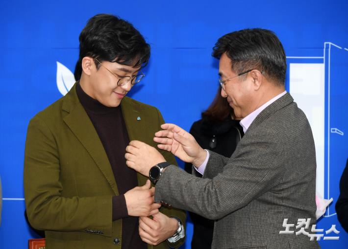 더불어민주당 '영입인재 2호'인 원종건 씨가 29일 서울 여의도 국회에서 열린 더불어민주당 인재영입 발표회에서 윤호중 사무총장으로부터 당원 배지를 받고 있다.