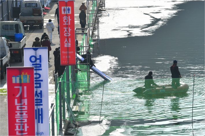 기록적인 겨울철 폭우와 사투를 벌인 강원 화천군이 화천산천어축제장 얼음판을 지키느냐 구슬땀을 흘리고 있다.