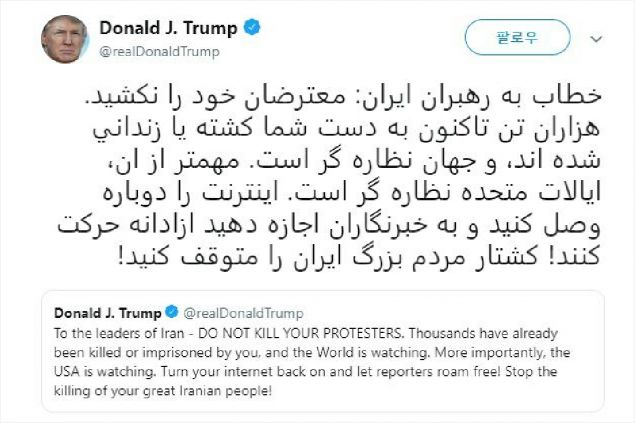 트럼프, 페르시아어로 트윗 "이란 시위대 죽이지 말라"