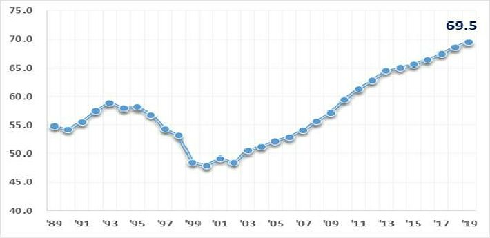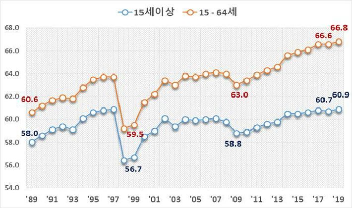 지난해 15세 이상 고용률이 22년 전 최고치와 동률을 이루고, OECD(경제협력개발기구) 비교 기준인 15~64세 고용률은 1989년 통계 집계 이래 역대 최고치를 경신했다.